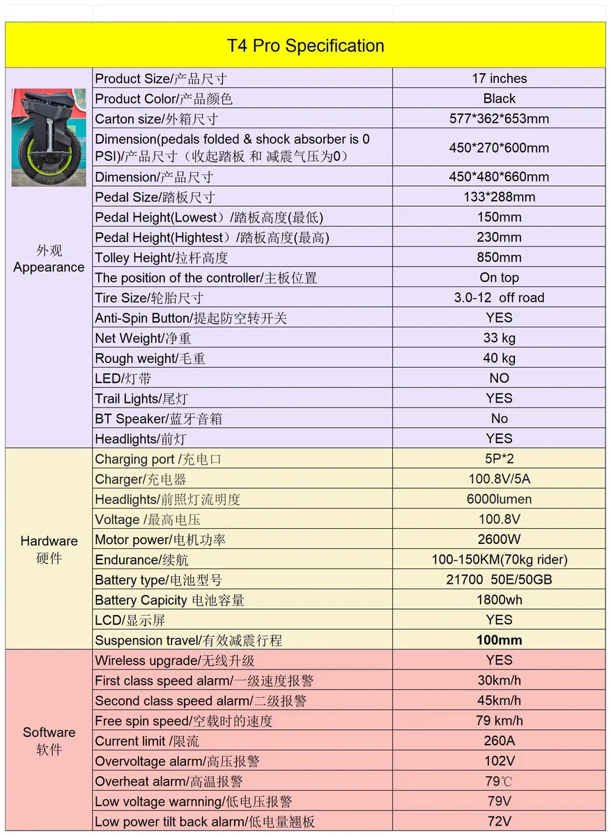 Begode Monociclo Eléctrico T4 Pro - 2600W Potencia | Batería 18Ah | Velocidad 36mph | Autonomía 60mi