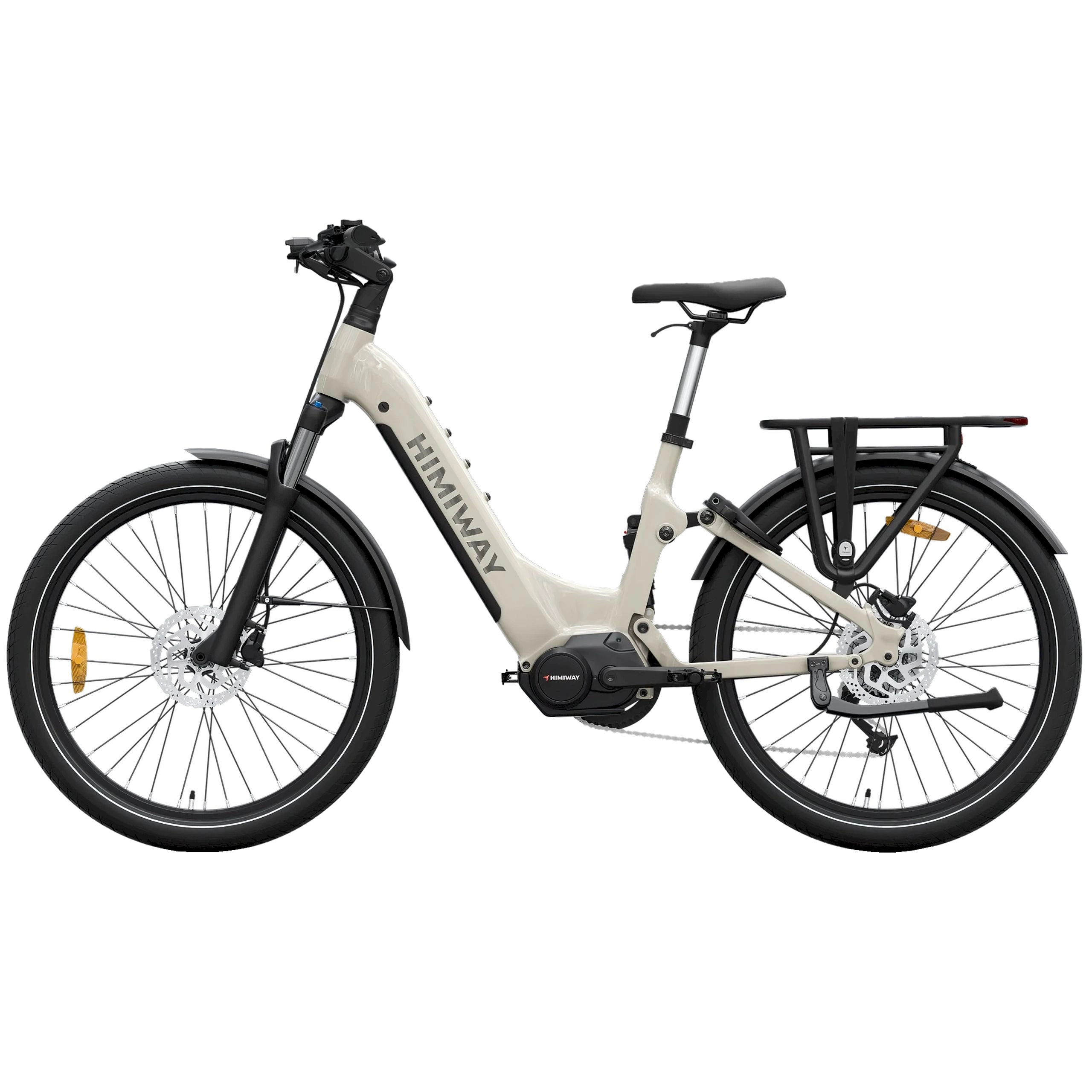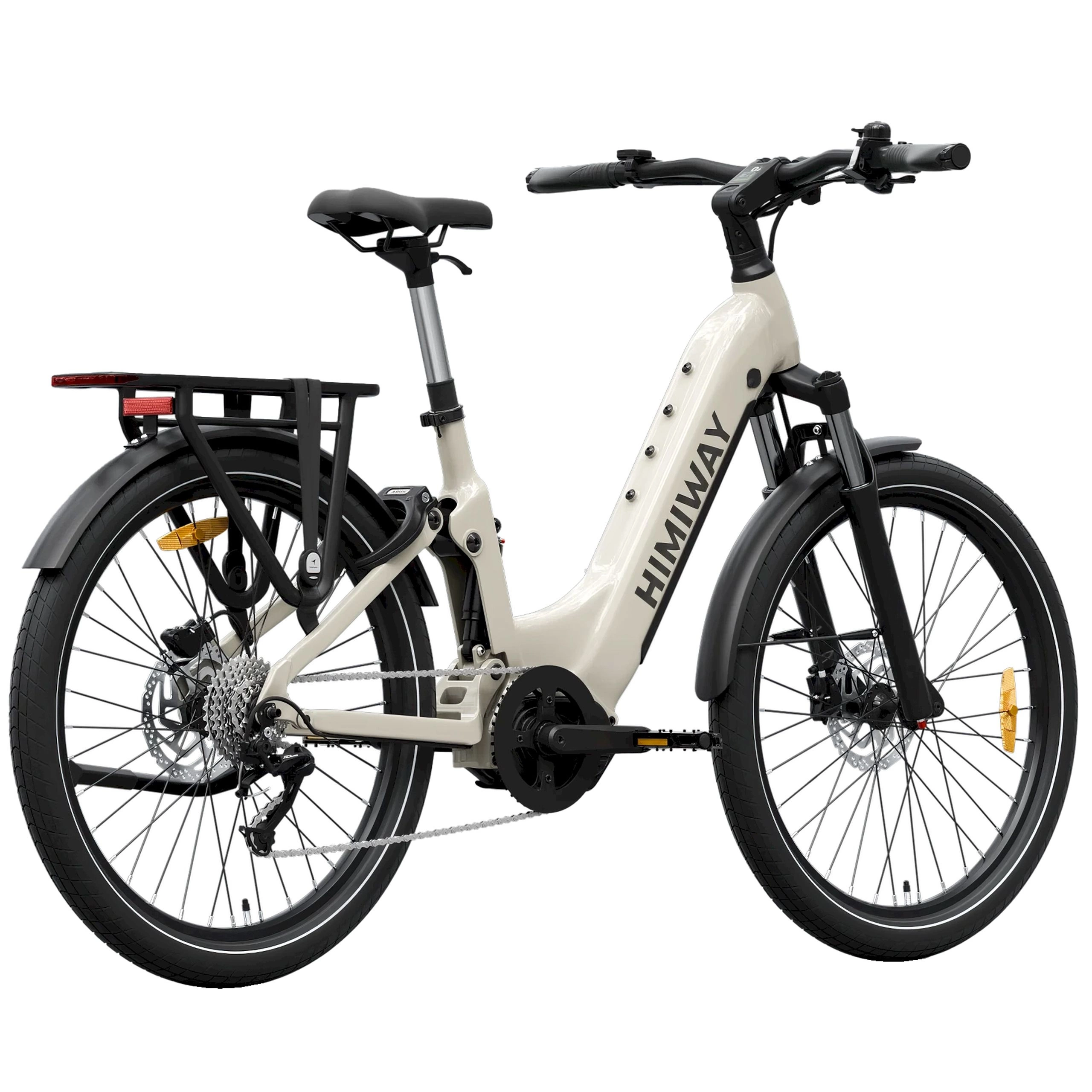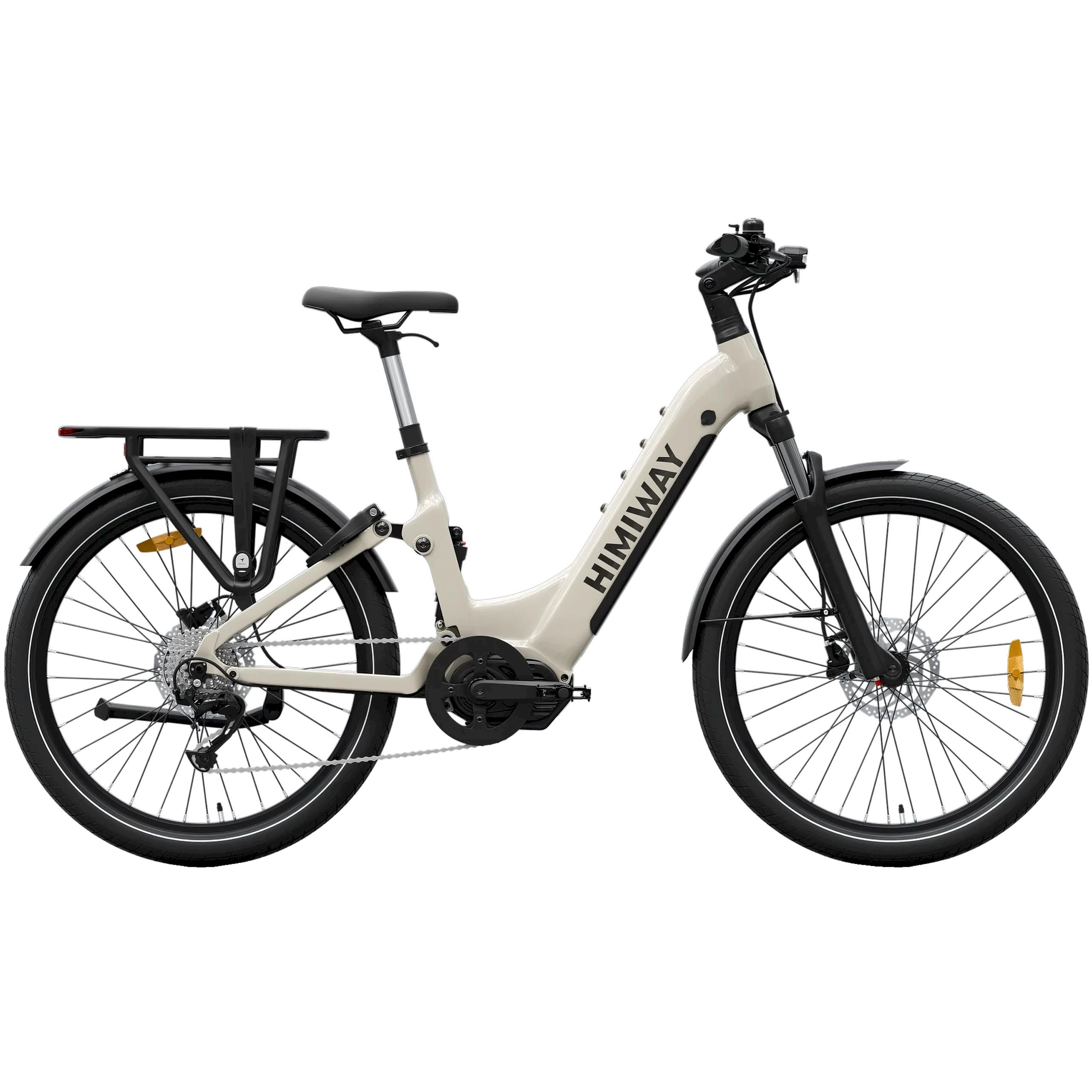 La bicicleta tiene un diseño limpio con un cuadro bajo y escalonado que facilita el subir y bajar. El cuadro se curva hacia abajo en lugar de tener un tubo superior tradicional, por lo que los usuarios no tienen que balancear la pierna sobre el asiento. La bicicleta viene con un portabultos trasero perfecto para llevar bolsas y tiene guardabarros de cobertura total para evitar que el agua y el barro salpiquen la conductor. La Himiway A7 Pro está disponible en blanco y negro, beige, naranja oscuro, verde y verde esmeralda. ¿Quiere una bicicleta que lo haga todo? La Himiway A7 Pro es perfecta si quieres una bicicleta eléctrica que esté preparada para todo sin tener que añadir piezas adicionales más adelante