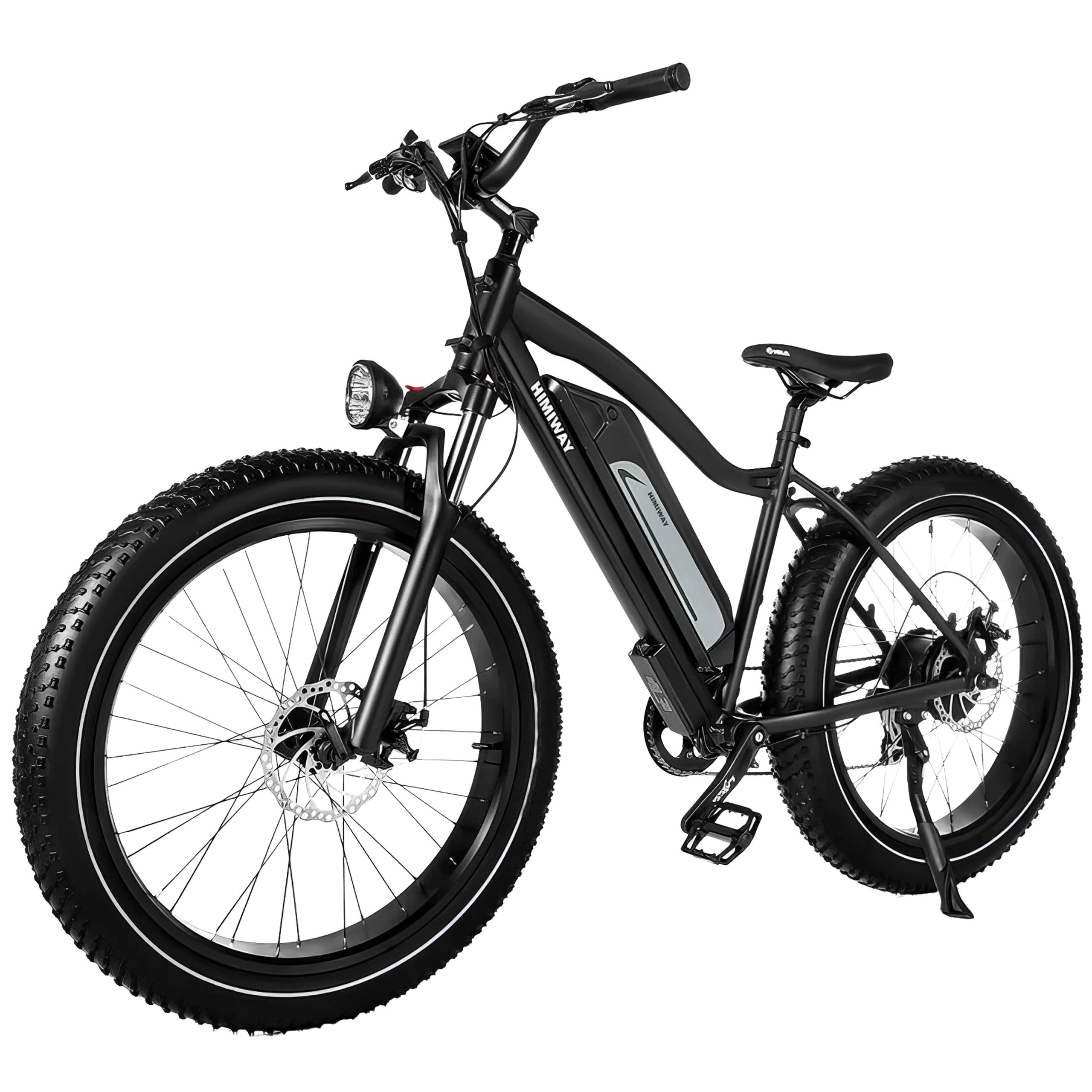 La horquilla de suspensión proporciona 95 mm de recorrido para absorber los impactos, con ajustes personalizables para el peso conductor y una función de bloqueo para una conducción eficiente en carretera. Los gruesos neumáticos de 26 pulgadas y 4 pulgadas de ancho garantizan una tracción fiable en diversas superficies, desde el asfalto hasta la arena. Los frenos de disco mecánicos con rotores de 180 mm ofrecen una capacidad de frenado fiable en todas las condiciones.