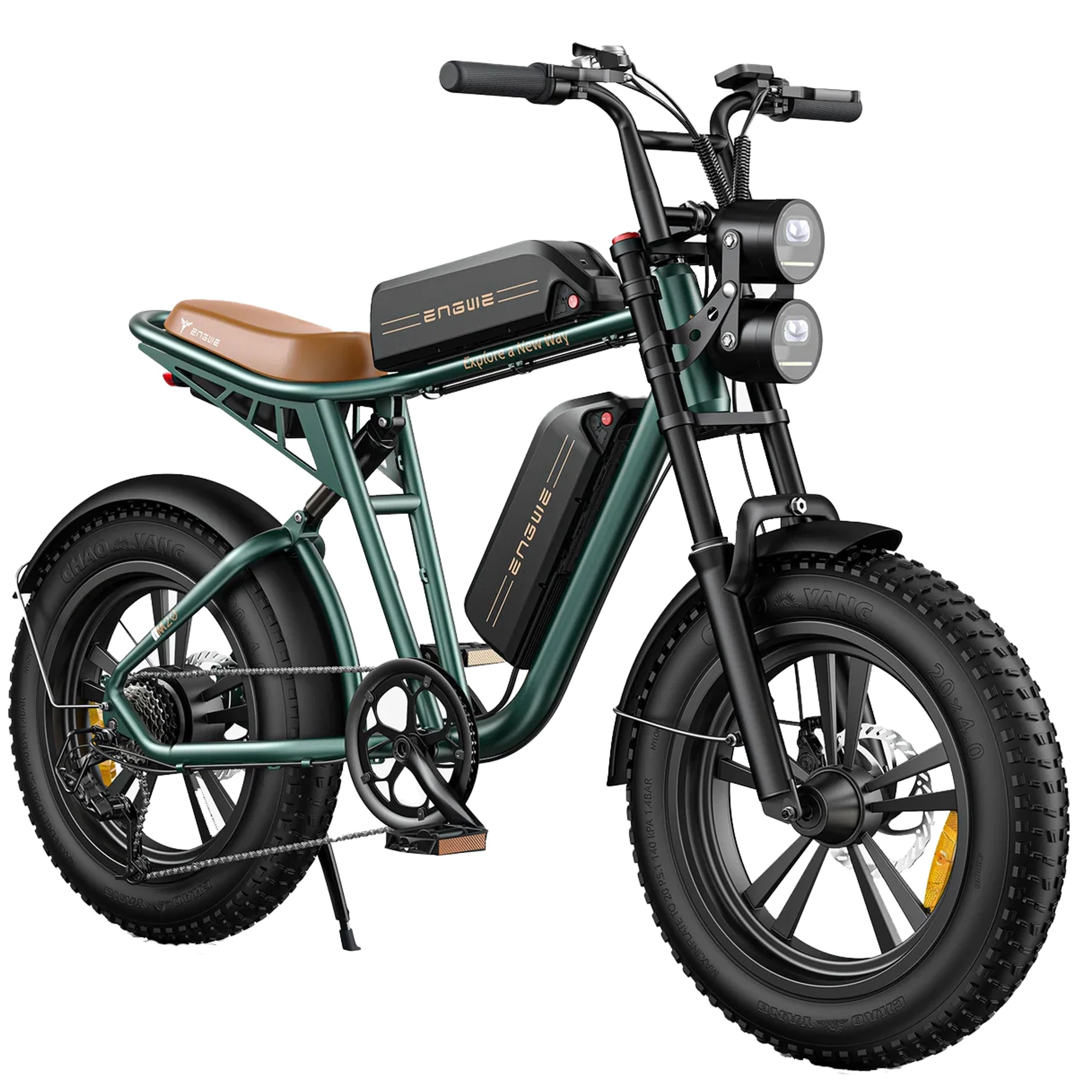 Los neumáticos de 20" x 4,0" de triple capa, fabricados con caucho importado, nano trenzado de carbono y cámaras de caucho butílico, garantizan una tracción y un confort excepcionales. Combinado con un sistema de suspensión dual&mpanel;amortiguadores hidráulicos delanteros y de aire traseros&mpanel;esta configuración proporciona una conducción suave en los senderos más difíciles, duplicando la absorción de impactos en comparación con las e-bikes estándar.