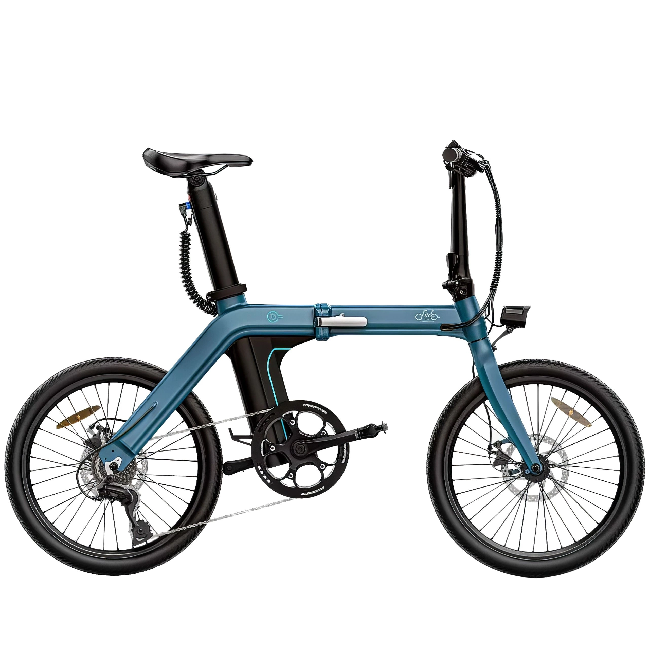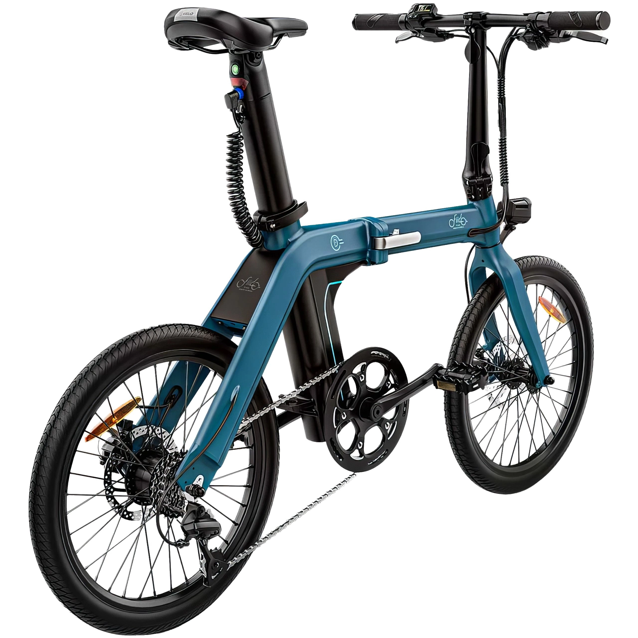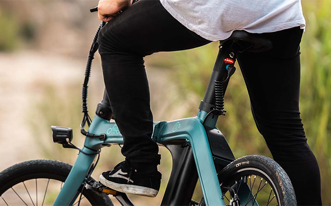 La Fiido D11 se presenta en un llamativo color azul turquesa con un cuadro único en forma de M. La batería se oculta en la tija del sillín. La batería se oculta en la tija del sillín para mantener el orden. El sillín, el manillar y los frenos negros crean un contraste perfecto. Las ruedas de 20 pulgadas con neumáticos finos le dan un aspecto deportivo. Incluso plegada, la bicicleta mantiene un buen aspecto.