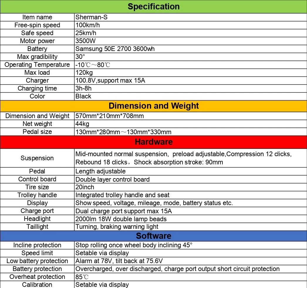 La Leaperkim Sherman-S 3600Wh 50E es una bestia de machine diseñada para superar los límites de los vehículos eléctricos personales. Con una construcción robusta y características de rendimiento lleno de energía, el Sherman-S está diseñado para aquellos que anhelan la aventura sin sacrificar la velocidad y la eficiencia. Este monociclo eléctrico ofrece una conducción emocionante