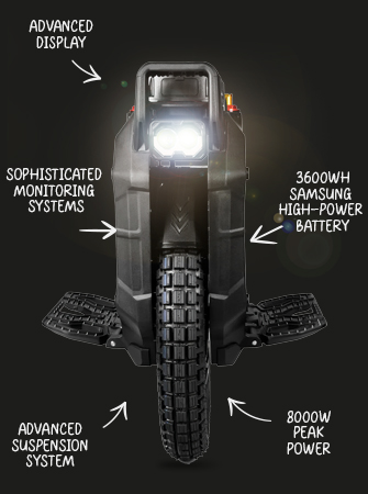 La EUC alcanza velocidades de giro libre de hasta 62 mph (100kph) con un potente motor de 3500W y una potencia máxima de 8000W